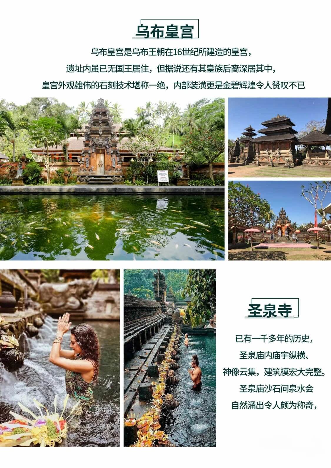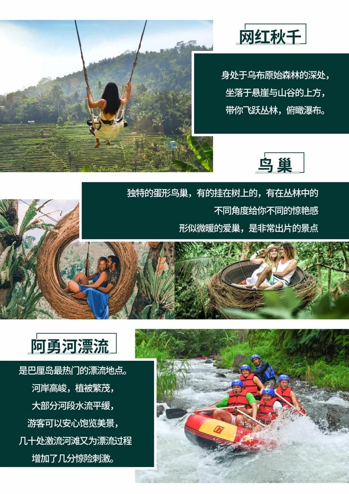 | D6 | 阿勇河漂流1小时+网红秋千+鸟巢拍照+乌布皇宫+圣泉寺→巴厘岛机场 |