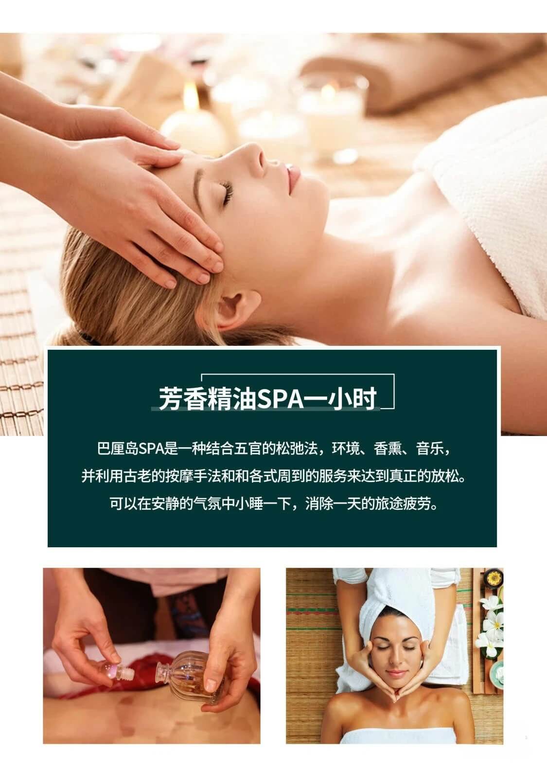 巴厘岛SPA是一种结合五官的松弛法,环境、香熏、音乐,并利用古老的按摩手法和和各式周到的服务来达到真正的放松,您不妨可以在安静的气氛中小睡一下,消除旅途的疲劳。全套身体护理做下来,一定会让你有一种受到皇室待遇的精致呵护的感觉,快来体验一次心灵“SPA”,充分感受巴厘岛带给您的无限悠闲乐趣。温馨提示:(男女皆可,但12岁以下小孩及孕妇不宜,恕不退费)
