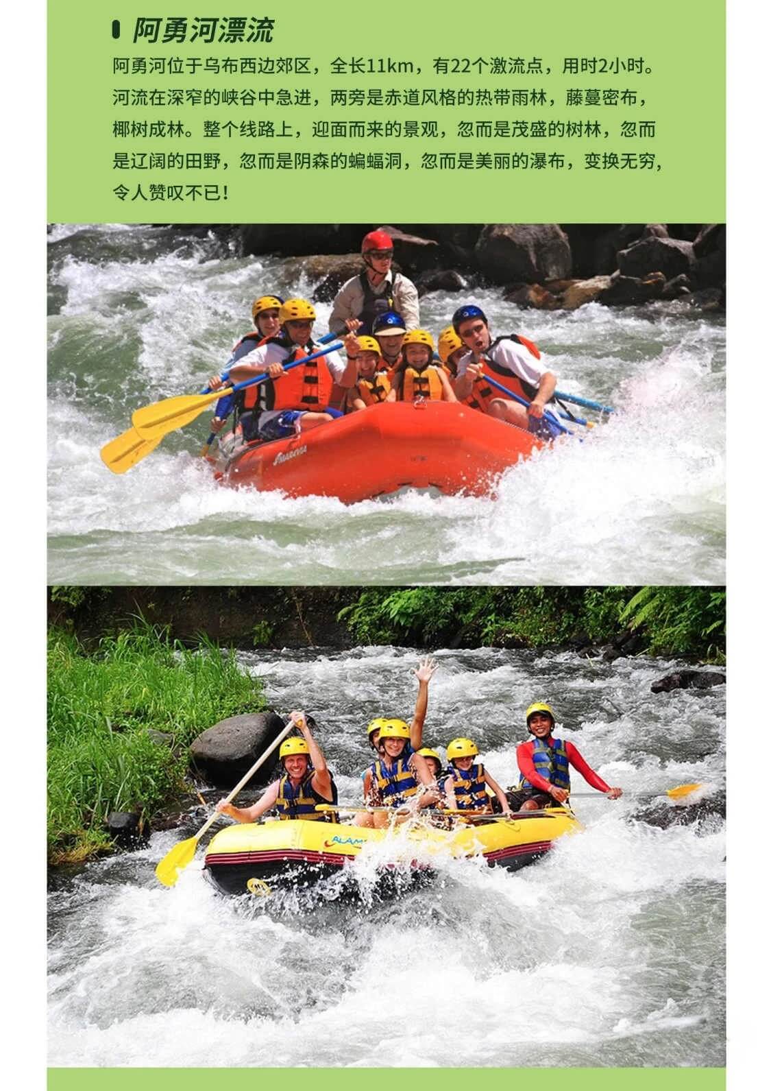 亦叫爱咏河,阿勇河长11公里,流经上有22处急流点,两岸均是原始森林的变换景象。整个线路上,迎面而来的景观,忽而是茂盛的树林、忽而是辽阔的田野;忽而是阴森的蝙蝠洞;忽而是美丽的瀑布,变换无穷,令人赞叹不已。难怪许多游客感慨,到了阿勇河漂流,才知道真正的巴厘岛。