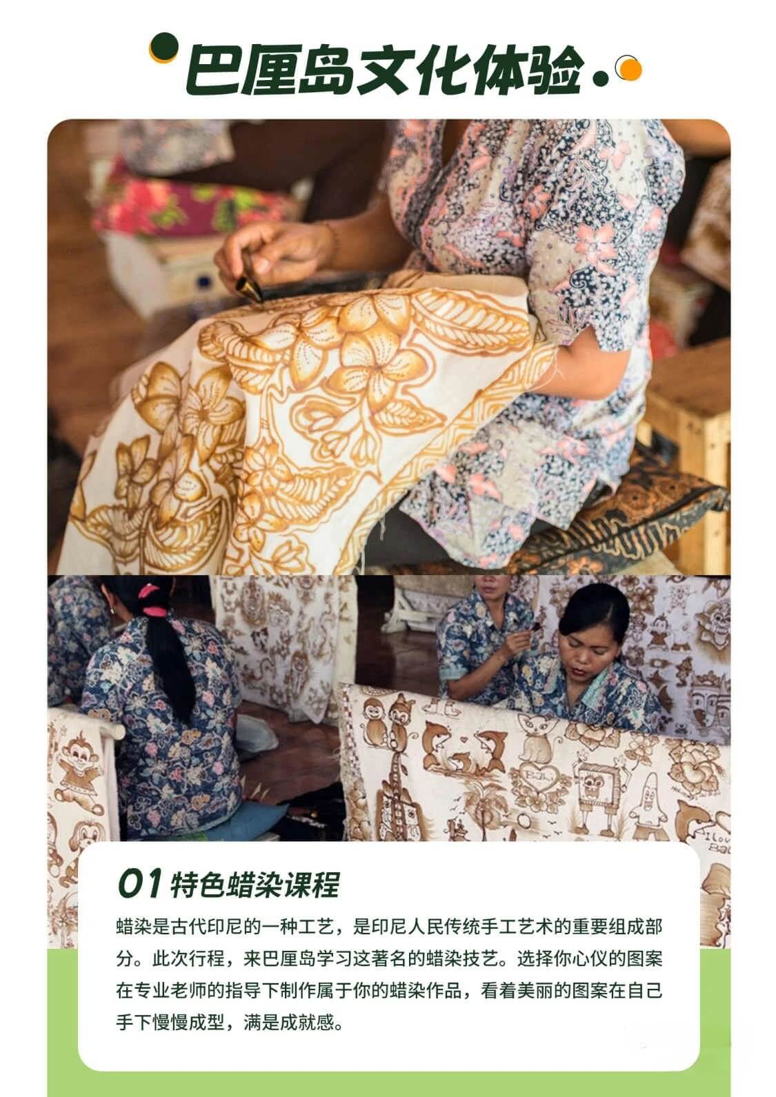 来到蜡染村,这里的艺术家们都是土生土长的村民,我们一起来参观了解巴厘岛的国宝技艺巴迪克手工蜡染。蜡染是古代印尼的一种工艺,用特制的画笔沾上烧化的蜡在棉布上作画。体验古印尼的传统手工艺文化,古老的设备、素雅的图案、原始的工艺。