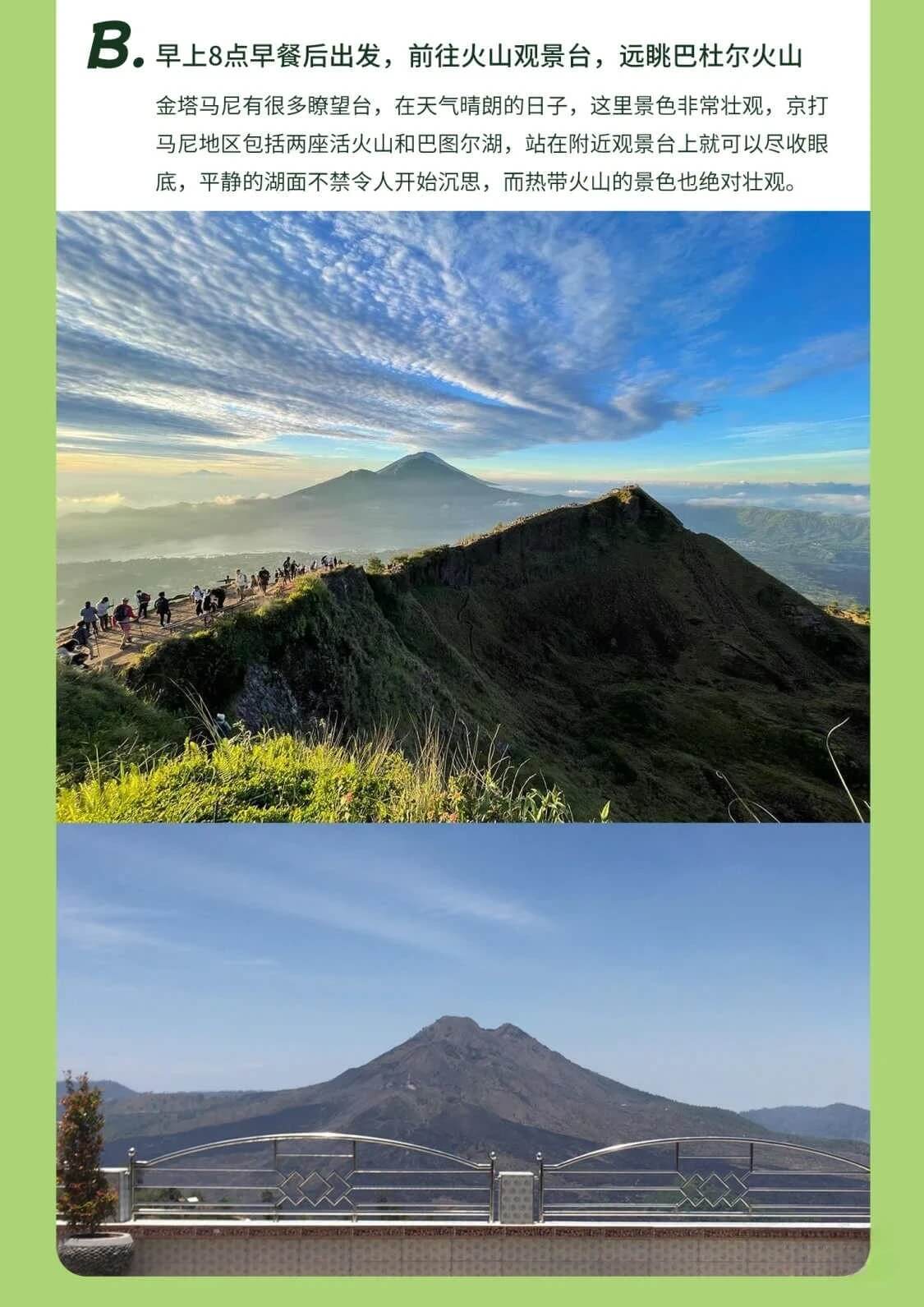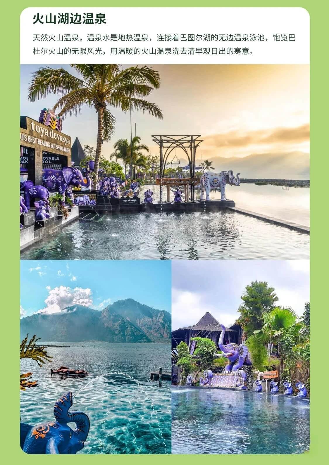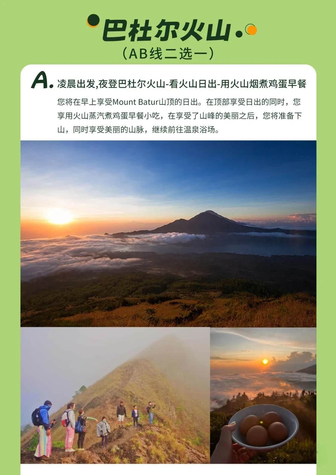 | D5 | AB线二选一: A凌晨出发,夜登巴杜尔火山,看火山日出,用火山烟煮鸡蛋早餐,泡火山湖边温泉 B早上8点早餐后出发,前往火山观景台,远眺巴杜尔火山,泡火山湖边温泉 前往巴厘岛博物馆,了解巴厘岛历史 金巴兰海滩观日落 |