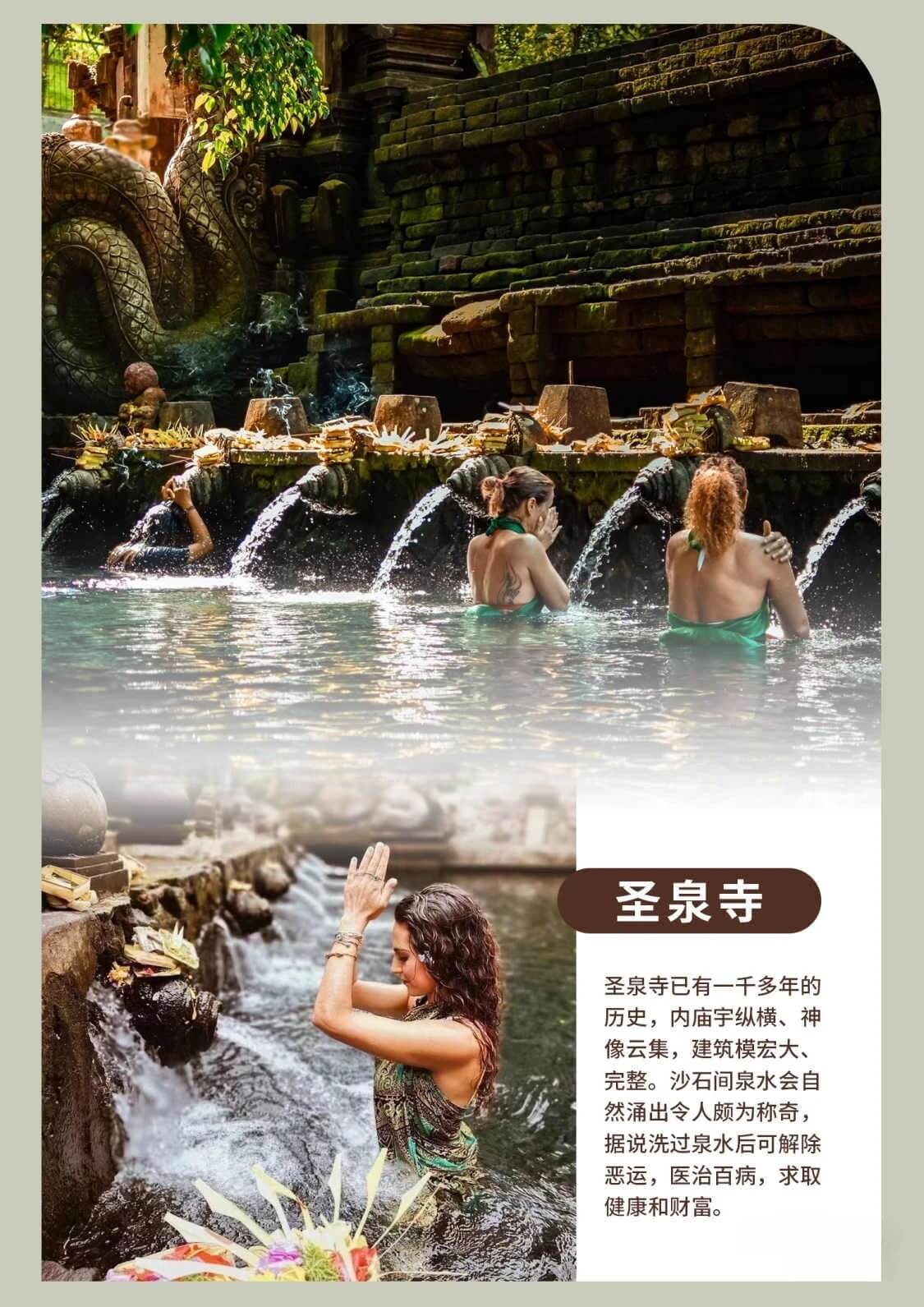 此庙已有一千多年的历史,圣泉庙内庙宇纵横、神像云集,建筑模宏大、完整。石头圣龛上早是苔痕斑斑,而泉涌依然如当年。圣泉庙建筑规模宏大完整,从此处可以看到里岛庙宇的所有特点。圣泉庙沙石间泉水会自然涌出令人颇为称奇,据说洗过泉水后可解除恶运,医治百病,求取健康和财富,圣水池分别设有女人池,男人池和儿童池。巴厘人深信圣泉水具有神奇的疗效,对这道圣泉顶礼膜拜,许多居民经常在此沐浴,驱除厄运,洁净自身,洗净灵魂,祈求平安。