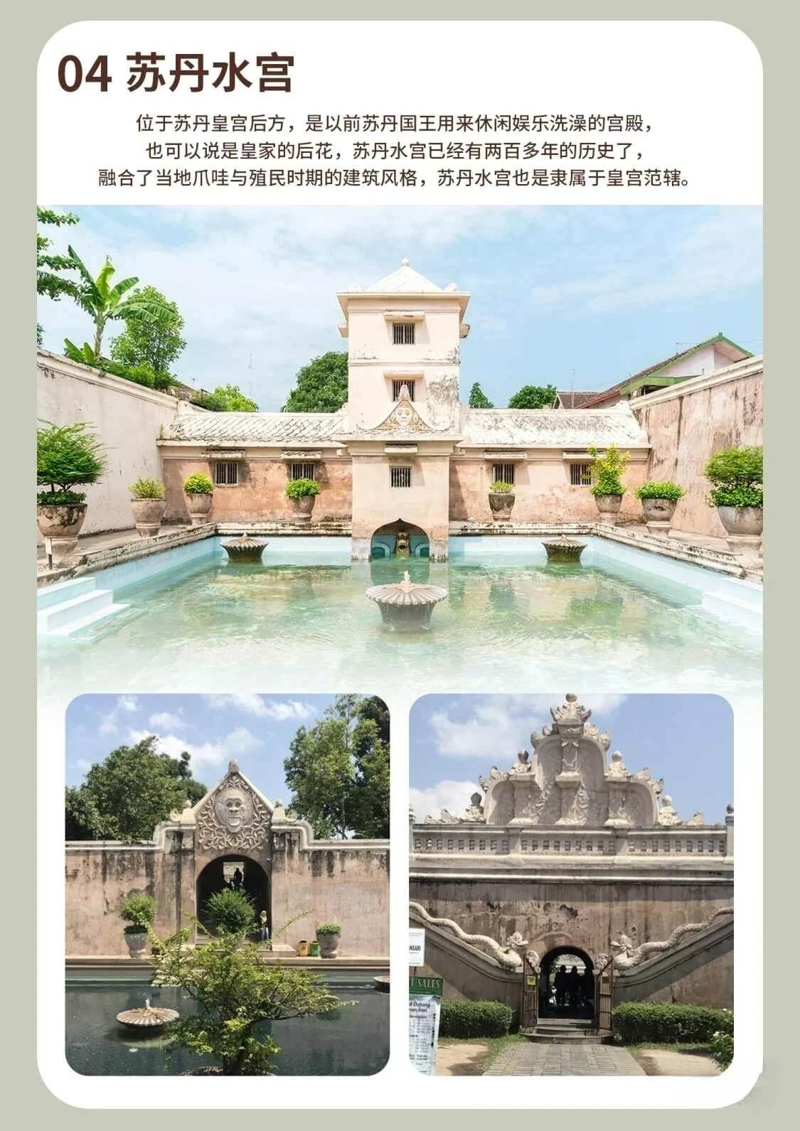 位于苏丹皇宫后方,是以前苏丹国王用来休闲娱乐洗澡的宫殿,也可以说是皇家的后花,苏丹水宫已经有两百多年的历史了,融合了当地爪哇与殖民时期的建筑风格,苏丹水宫也是隶属于皇宫范辖,以前苏丹王怜悯穷苦人民,将自己的王宫部分地区开放给民众居宿,而在皇宫附近形成了民宅区,印尼的贫富差距真的很大,一般人民的房子屋顶都是铁皮屋再搭上瓦片,很多瓦片都斑驳剥落了也没有修复。