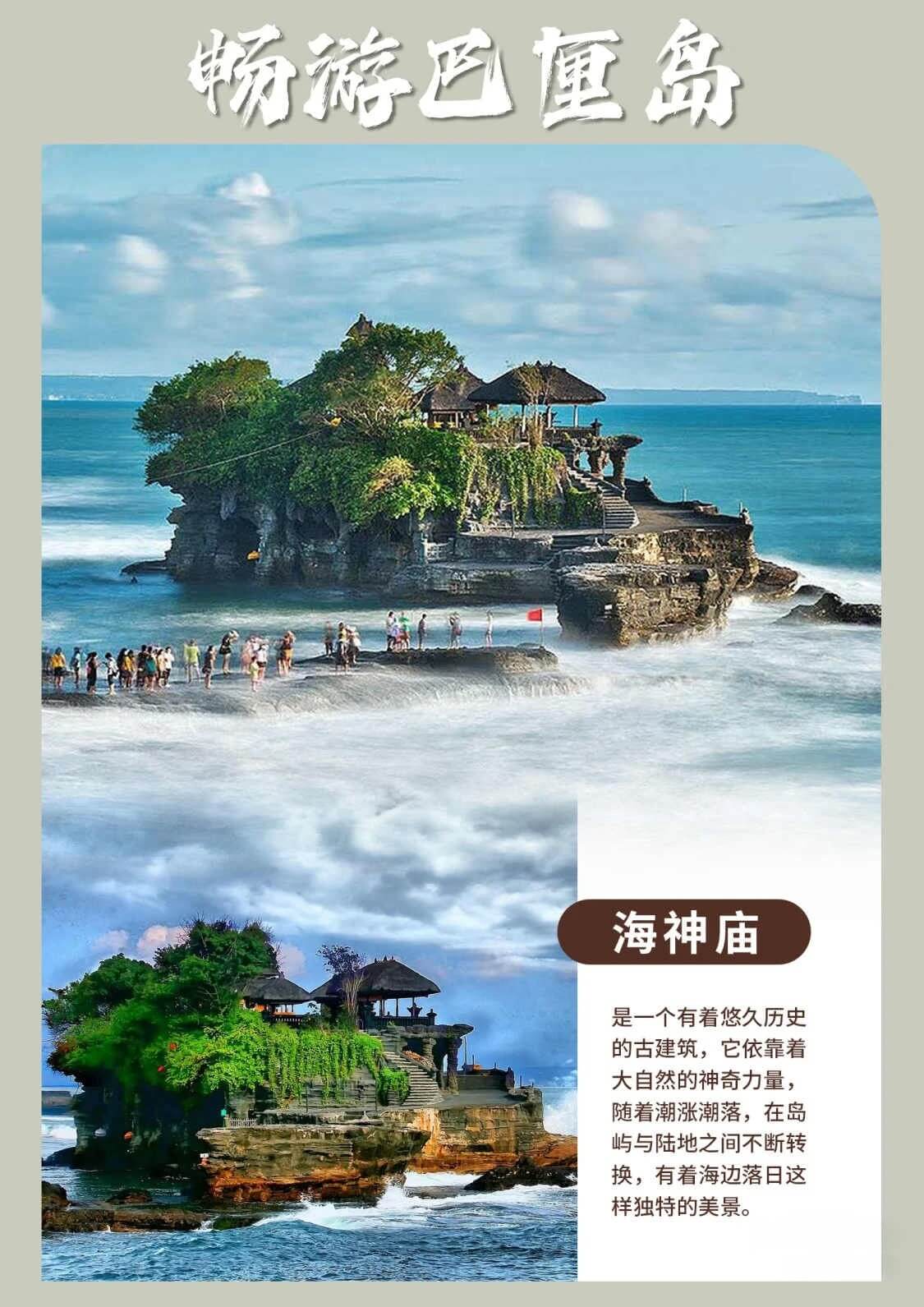 早餐后,乘车前往闻名全球的海神庙,建于十六世纪,是十六世纪的祭司海样尼拉萨在海中冥思的地方,它也被称为“海上之地”,祭祀海之守护神,它坐落在海中形似船只的一块巨岩上,是巴厘岛著名的六大寺庙之一。涨潮时,此庙四周环绕海水和陆地完全隔离。落潮时方可以相通,搭配南洋夕照的热带夕阳海景,为巴厘岛代表性风景之一。海神庙旁边有个当地的风情小市集,这里有着许多印尼特色的手工艺品和特色的服装,各式货品都有,例如银器、木雕、编织、各式蔬果、衣服、沙龙、皮件、鞋子及纪念品、乐器等等,并且价廉物美,多种多样,令你爱不释手。您可以在此淘一批风土人情的物品回去,记得在讲价合理后要兑现购买承诺,这也是当地风俗人文的风情景点之一。