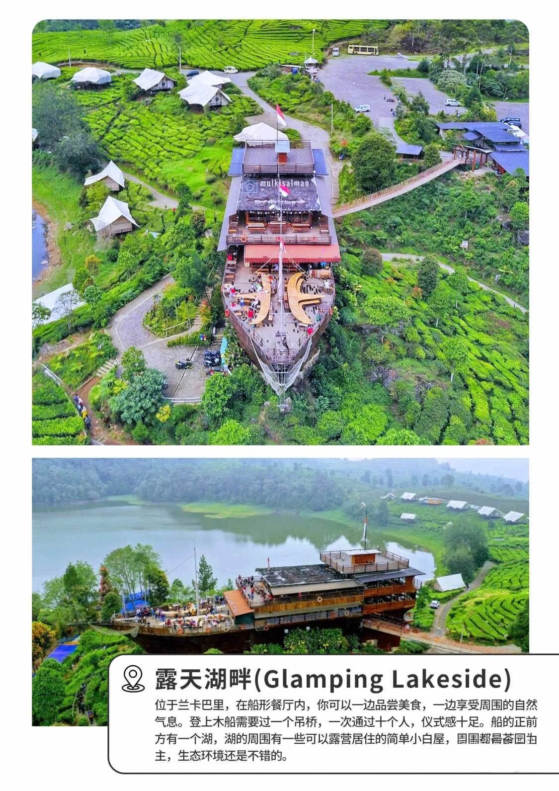 位于兰卡巴里,在船形餐厅内,你可以一边品尝美食,一边享受周围的自然气息。登上木船需要过一个吊桥,一次通过十个人,仪式感十足。船的正前方有一个湖,湖的周围有一些可以露营居住的简单小白屋,周围都是茶园为主,生态环境还是不错的。