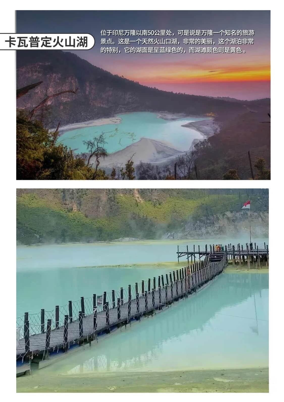 火山湖位于万隆以南50公里处印尼语中,Kawah是「火山口」之意,而Putih意味着「白色」,「白色的火山湖」便是Kawah Putih真正想表达的意思。但是在卡瓦普定火山湖能看到什么颜色,全看天意;湖水会根据当天水里硫磺的集散度以及周边天气情况,在浅蓝、蓝白、白色、绿色和棕色之间变化,每一次去,都有不一样的惊喜。