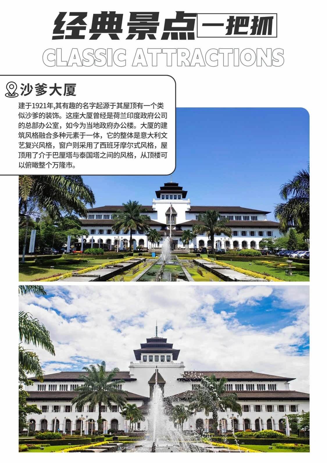 曾经是荷兰印度政府公司的总部办公室,屋顶有一个类似于人气美食----沙爹的装饰,这也是现在建筑名字的由来,如今为当地政府办公楼。这座建筑融合多种风格—窗户采用西班牙摩尔式,整体采用意大利文艺复兴风格,屋顶则用了介于巴厘塔与泰国塔之间的风格,从顶楼可以俯瞰整个万隆市。