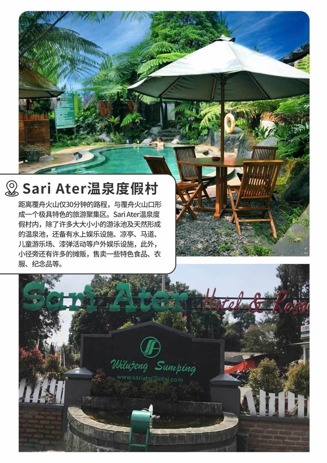 距离覆舟火山仅30分钟的路程,与覆舟火山口形成一个极具特色的旅游聚集区,大部分旅客会选择在火山口拍完照后,到温泉区享受泡汤的乐趣。Sari Ater温泉度假村内,除了许多大大小小的游泳池及天然形成的温泉池,还备有水上娱乐设施、凉亭、马道、儿童游乐场、漆弹活动等户外娱乐设施,此外,小径旁还有许多的摊贩,售卖一些特色食品、衣服、纪念品等。