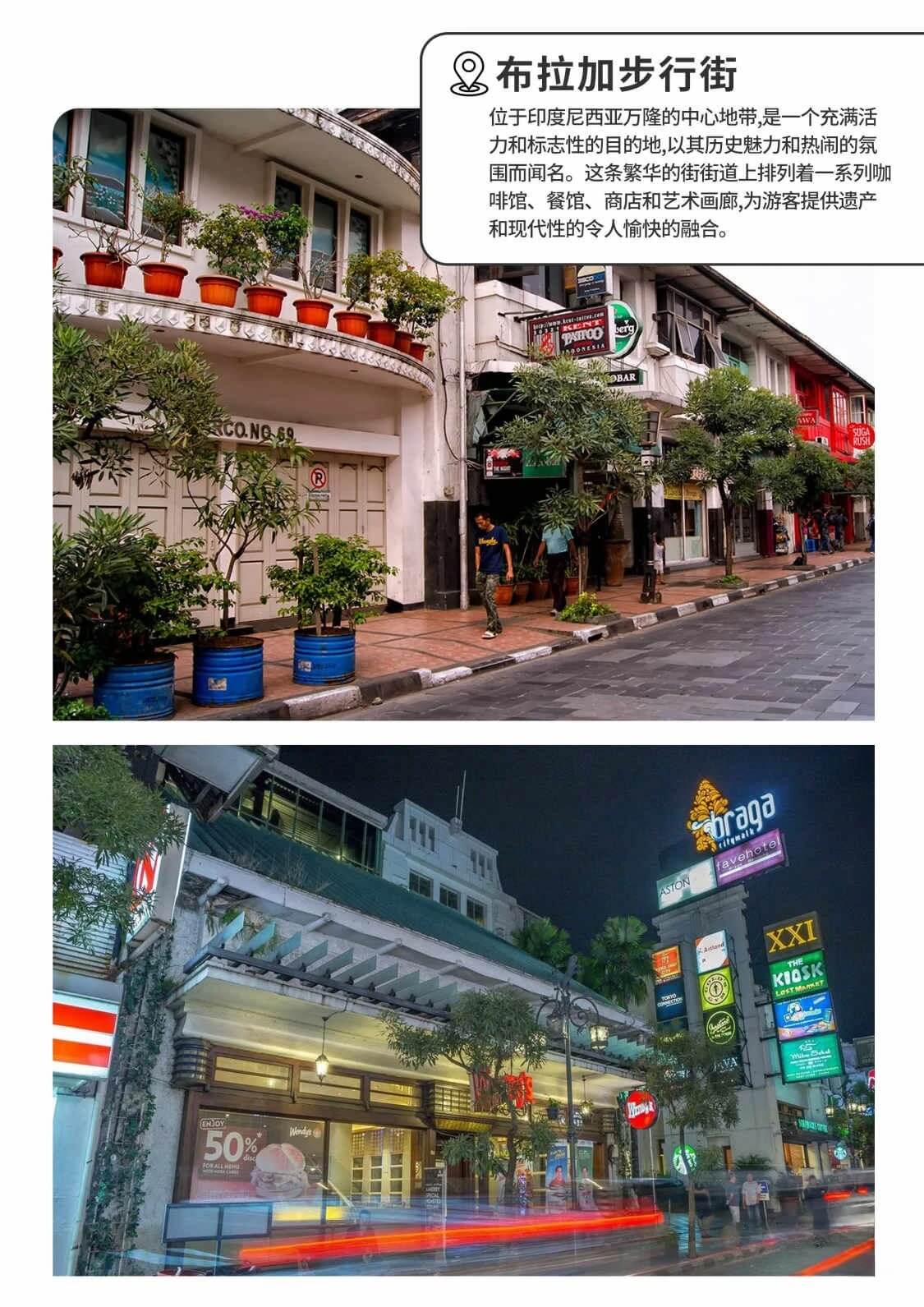 布拉加步行街是万隆中心的一条小街道,于20世纪20年代作为散步街道而出名。街道上到处是别致的咖啡馆、精品店和餐厅,弥漫着浓郁的欧洲气息,使得万隆获得“爪哇的巴黎(Paris of Javanickname)”的称号。