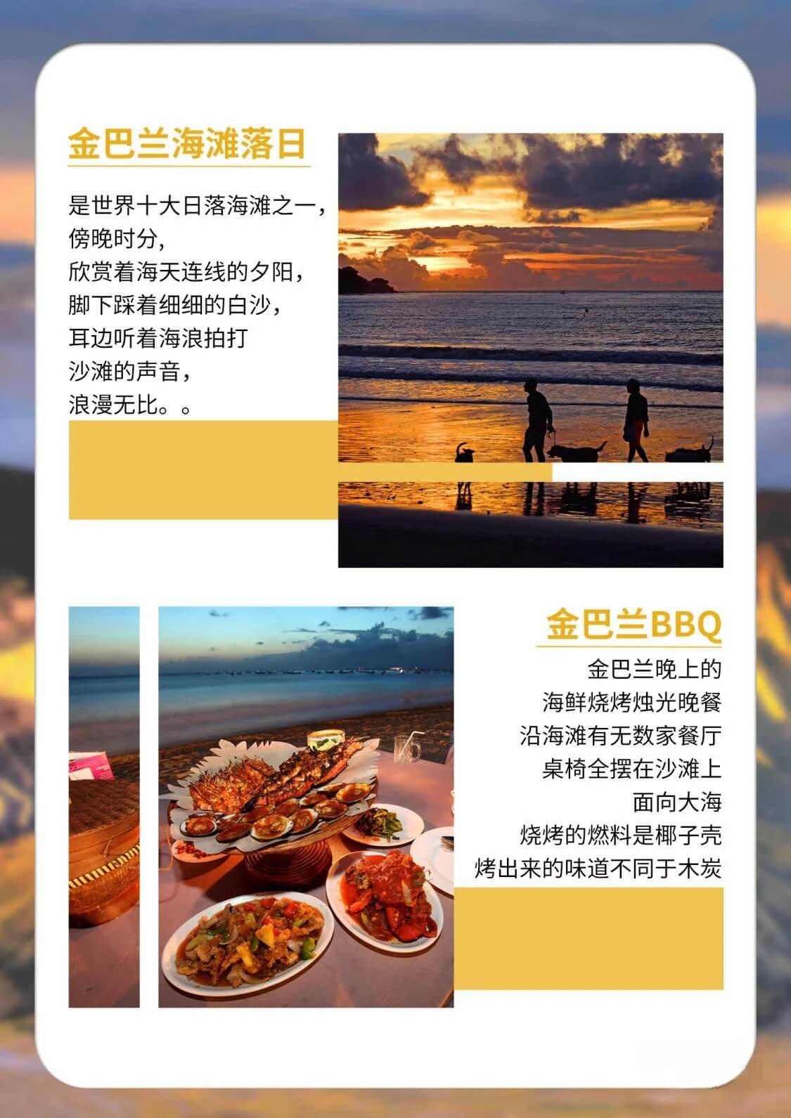 早餐: 酒店早餐 午餐: 中华料理 晚餐: 金巴兰海鲜BBQ