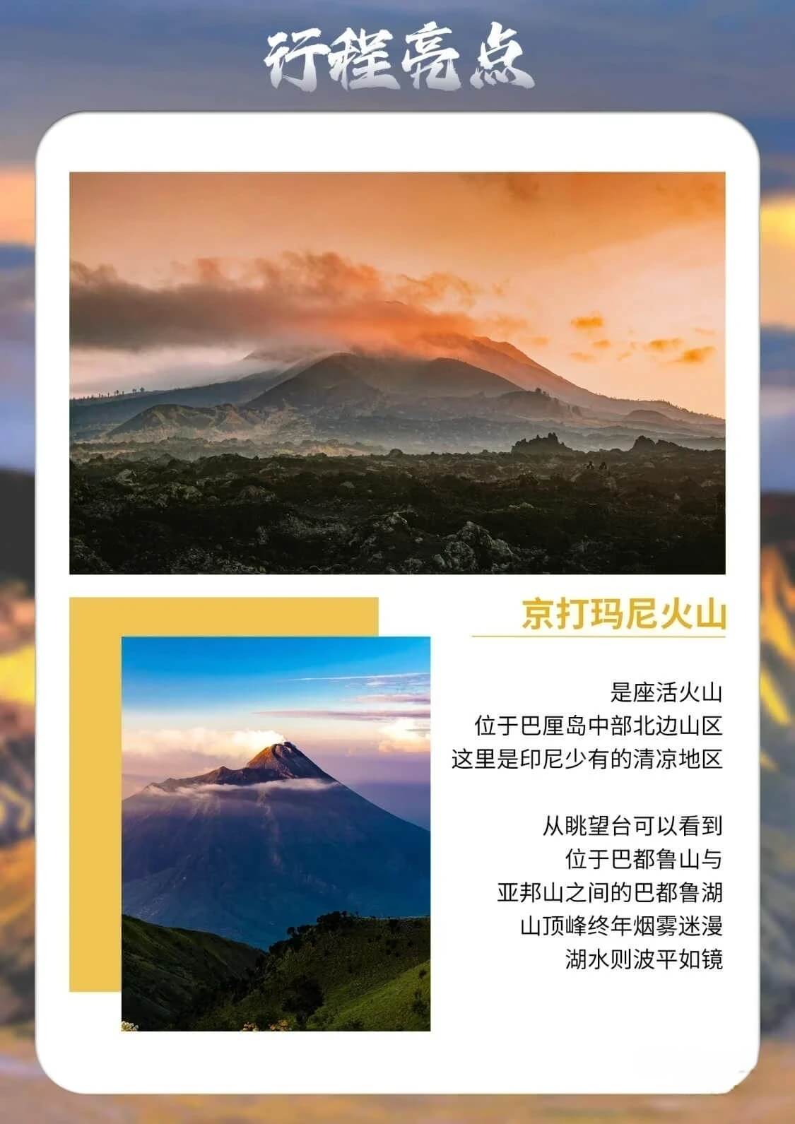 凌晨2点出发前往京打玛尼火山,这里是印尼少有的清凉地区,所以要记得穿件外套。在火山脚下乘坐越野吉普车攀爬火山,到山腰专属观景平台观看云海日出,眺望巴杜尔火山、阿贡火山、阿邦火山。