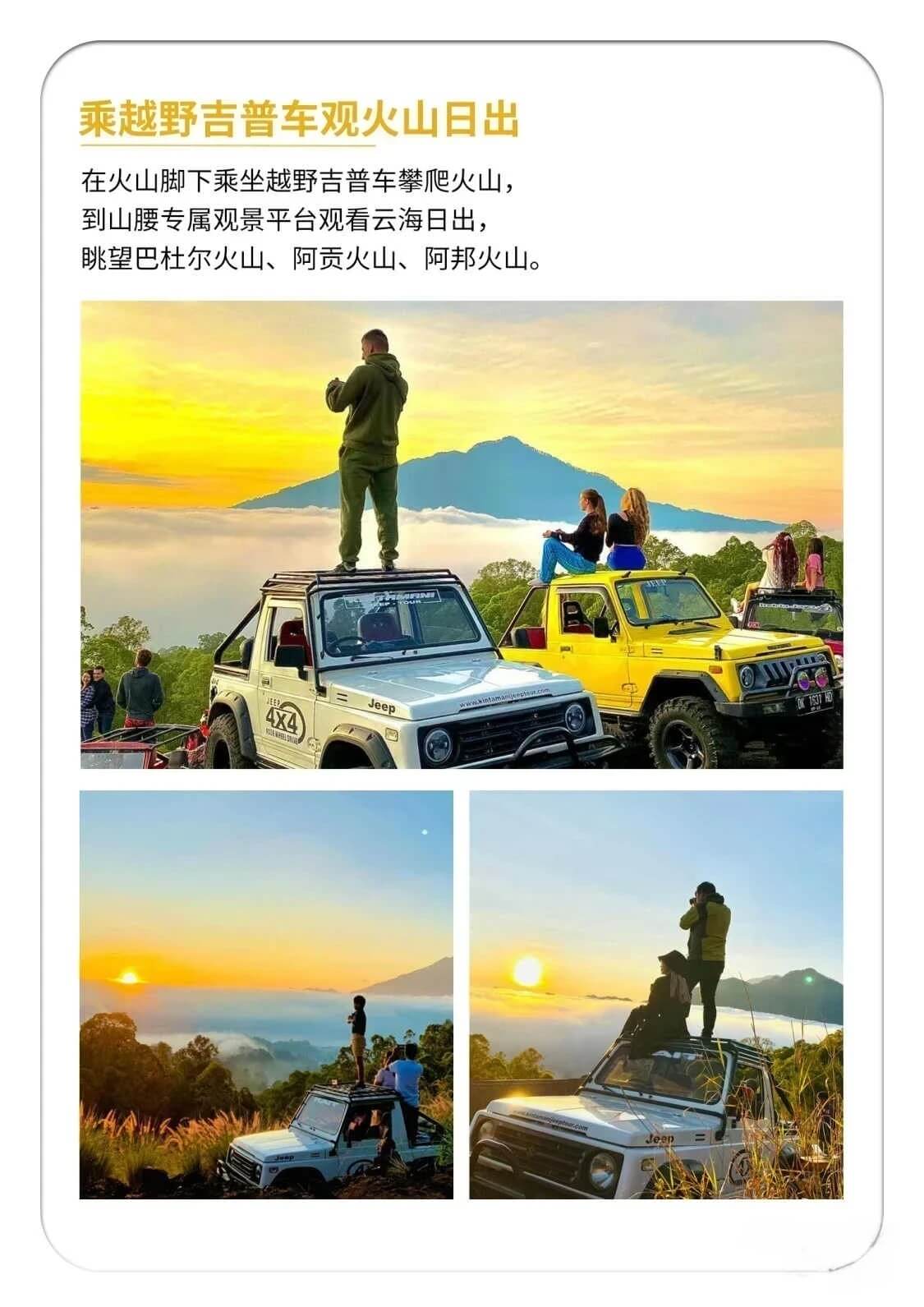 凌晨两点起床,奔赴京打玛尼火山,换乘越野吉普车攀爬至观景平台,在云海之上守候巴杜尔火山、阿贡火山、阿邦火山的壮丽日出,随后前往火山温泉俱乐部,在无边泳池中饱览火山湖景,洗去寒意。
