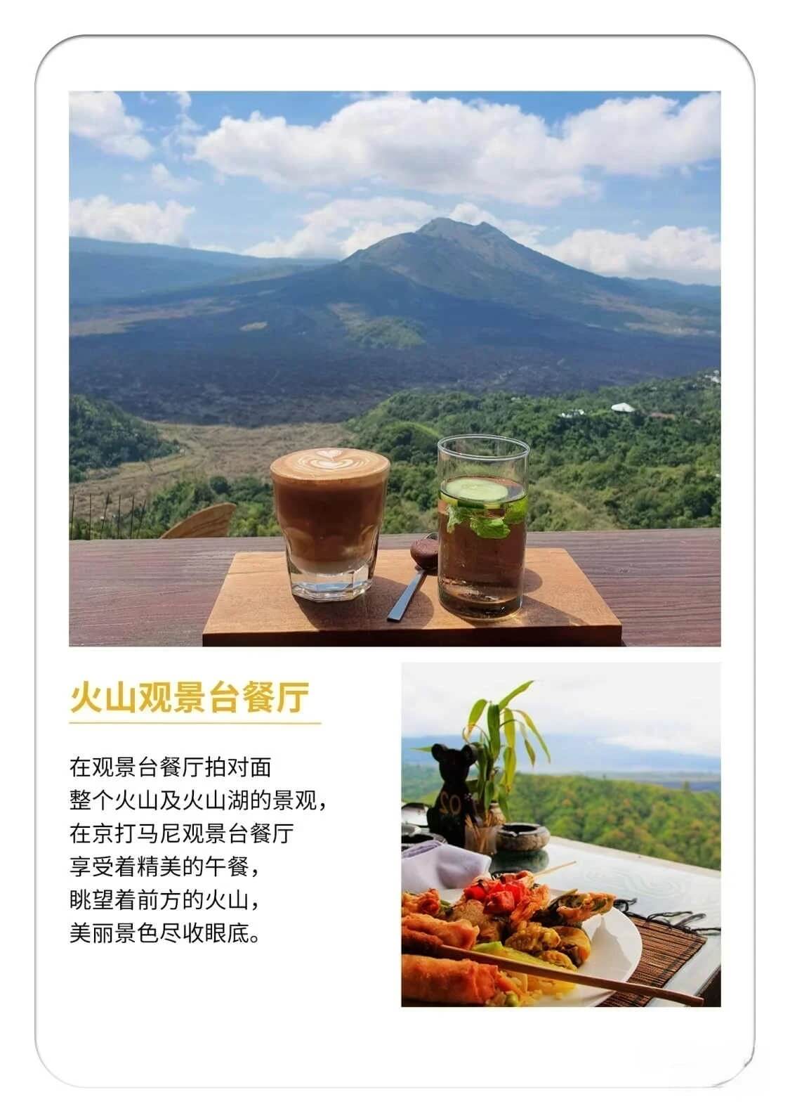 早餐过后,前往火山温泉俱乐部,在连接着巴图尔湖的无边温泉泳池,饱览巴图尔火山的无限风光,用温暖的火山温泉洗去清早观日出的寒意,给你一个美好的悠闲度假时光。在火山温泉俱乐部休息过后,我们前往火山观景台餐厅享用印尼自助餐。