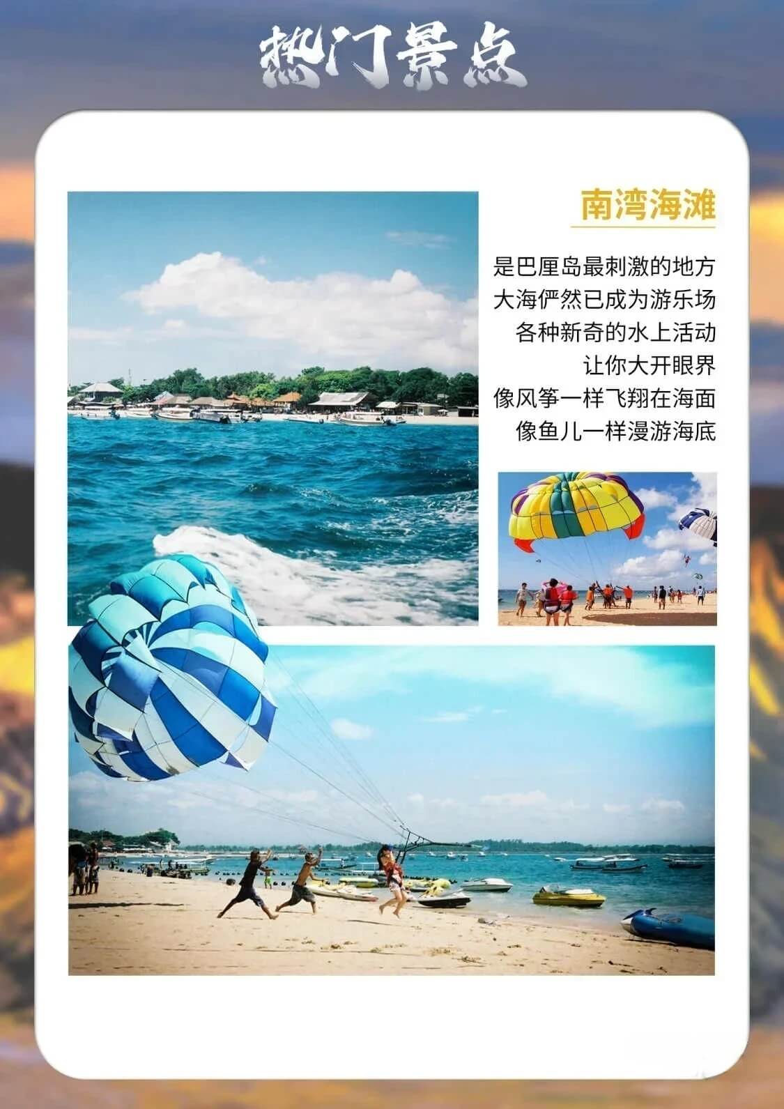 也叫贝诺湾或蜜月湾,迎向海阔天蓝及狭长无边的海滩,这里是巴厘岛最刺激的地方,大海俨然已成为游乐场,各种新奇的水上活动让你大开眼界,像风筝一样飞翔在海面、像鱼儿一样漫游海底,如果您想自费体验中意的海上机动项目,导游会预留足够的时间让你在碧海蓝天中追求感官上的刺激。