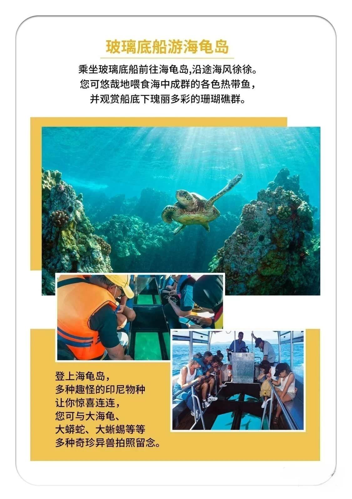 乘坐玻璃底船前往海龟岛,沿途海风徐徐,您可悠哉地喂食海中成群的各色热带鱼并观赏船底下瑰丽多彩的珊瑚礁群。登上海龟岛,多种猎奇趣怪的印尼物种让你惊喜连连,您可与大海龟、大蟒蛇、大蜥蜴等等多种奇珍异兽拍照留念,更有机会来一场惊心动魄、刺激悬疑的斗鸡大赛。
