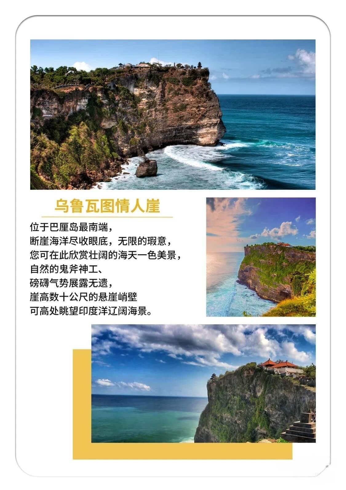 情人崖位于巴厘岛最南端,它的背后有一段凄美的中国梁祝式爱情悲剧,为此地平添了离奇色彩。断崖海洋尽收眼底,无限的瑕意,您可在此欣赏壮阔的海天一色美景,自然的鬼斧神工、磅礴气势展露无遗,崖高数十公尺的悬崖峭壁可高处眺望印度洋辽阔海景,开始酝酿属于巴厘岛特有悠闲假期。